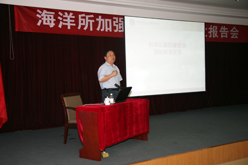5月21日,為進(jìn)一步加強(qiáng)反腐倡廉建設(shè),規(guī)范各類人員職務(wù)行為,中國(guó)科學(xué)院海洋研究所舉行“反腐倡廉建設(shè)專題報(bào)告會(huì)”,特邀中國(guó)科學(xué)院監(jiān)察審計(jì)局副局長(zhǎng)郭建軍作了題為“加強(qiáng)反腐倡廉建設(shè),預(yù)防職務(wù)犯罪”的主題報(bào)告。全所副研究員以上人員,各類項(xiàng)目課題組長(zhǎng)及相關(guān)人員,機(jī)關(guān)各部門全體人員等近200人參加了報(bào)告會(huì)。黨委書(shū)記啟堯主持了報(bào)告會(huì)。