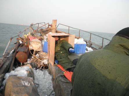 專家點(diǎn)評:擁擠的船艙、堆積的殘雪,體現(xiàn)了海岸帶工作者惡劣的工作環(huán)境和生活狀態(tài),軍大衣后背星星點(diǎn)點(diǎn)的水滴從另一個側(cè)面反應(yīng)了當(dāng)時作業(yè)環(huán)境的惡劣。圖中主人公為了躲避風(fēng)浪,將頭躲到紙箱中,說明了當(dāng)時一種寒冷、疲憊、惡劣到極致的工作現(xiàn)狀,然而,船只依然在顛簸的海面毅然的行駛著,他們在堅持……