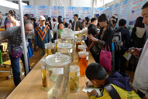 海洋知識展區(qū)內(nèi),前來參觀的市民絡(luò)繹不絕,許多中小學(xué)生拿著海洋知識競賽答題在展板前尋找答案,并不時向志愿者詢問。各式的海洋生物標(biāo)本吸引了許多參觀者的目光,志愿者耐心的為同學(xué)們講解標(biāo)本的產(chǎn)地、學(xué)名、習(xí)性和制作保存方法等知識。海洋微觀世界——有孔蟲展架前,參觀者對有孔蟲的千姿百態(tài)、美輪美奐贊不絕口。