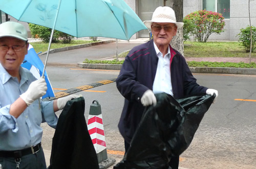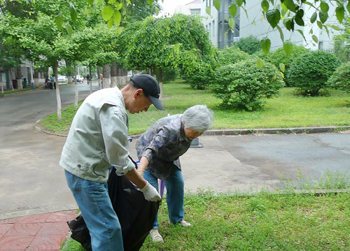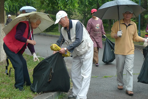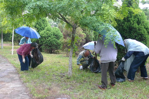 6月5日上午9:00,天空下著毛毛細(xì)雨, 60余位離退休職工志愿者提前來(lái)到離退辦門前,大家?guī)讉€(gè)人組成一小組,手提垃圾袋,沿著金屬所南圍墻,將李薰樓和工藝樓南側(cè)花園里的石塊、塑料、干樹枝等垃圾撿拾起來(lái)。一個(gè)多小時(shí)的勞動(dòng)結(jié)束了,大家手中的垃圾袋都裝的滿滿的、重重的,每個(gè)人的臉上都掛滿了汗水、雨水和開心的笑容。