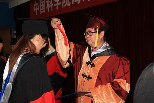 校長(zhǎng)孫松研究員和導(dǎo)師代表為畢業(yè)生頒發(fā)畢業(yè)證書(shū)