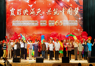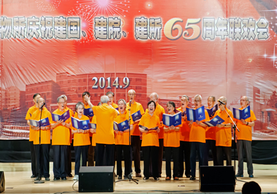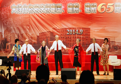 整個(gè)聯(lián)歡會(huì)過(guò)程中,觀眾們沉浸在一片興奮與激動(dòng)的海洋中,歡樂(lè)祥和的氣氛一浪高過(guò)一浪,送給臺(tái)上演員的掌聲一陣高過(guò)一陣——由《所志》編寫(xiě)組創(chuàng)作,所咨詢(xún)委12位委員深情演繹的配樂(lè)詩(shī)朗誦《獻(xiàn)給建所65周年》,完整地回顧了大連化物所走過(guò)的65年的光輝歷程,由衷地傾訴了老一輩化物所人對(duì)研究所的熱愛(ài)與忠誠(chéng);由平均年齡75歲的石油大學(xué)校友會(huì)20位老同學(xué)們合唱的《我為祖國(guó)獻(xiàn)石油》,款款地唱出了老同學(xué)們當(dāng)年為祖國(guó)科研事業(yè)貢獻(xiàn)青春力量的無(wú)悔與豪邁;由平均年齡82歲的3對(duì)老夫妻手牽手獻(xiàn)上的歌伴走臺(tái)秀《最浪漫的事》,掀起了觀眾們塵封的青春記憶,觸動(dòng)了在場(chǎng)每一位化物所人柔軟的心靈;在《異地老同志問(wèn)候視頻》中,觀眾們看到了久違的當(dāng)年一起奮斗的老同事那熟悉又親切的面龐,聽(tīng)到了他們發(fā)自?xún)?nèi)心的對(duì)祖國(guó)、院里和所里的真心祝福和對(duì)所里人的真誠(chéng)問(wèn)候。整臺(tái)晚會(huì)近200名演員,通過(guò)女聲組合《今天是你的生日,中國(guó)》、男聲四重唱《父親的草原母親的河》、舞蹈《紅旗頌》、《小蘋(píng)果》、《吉祥謠》、朗誦《中國(guó)夢(mèng)、我的夢(mèng)》、器樂(lè)合奏《我和我的祖國(guó)》、《好日子》、合唱《龍的傳人》、《共和國(guó)之戀》等節(jié)目為慶祝65周年齊聲喝彩,大家用各自不同的方式表達(dá)對(duì)祖國(guó)、對(duì)中科院、對(duì)化物所的熱愛(ài)和祝福。