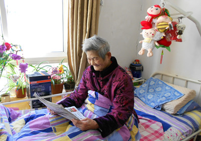 張貞慧老人讀報紙