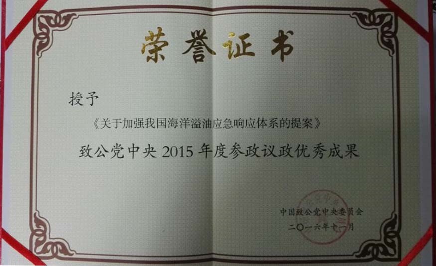 2016年11月,中國(guó)致公黨召開參政議政工作研討會(huì),會(huì)議對(duì)參政議政成果進(jìn)行了表彰,其中由中國(guó)科學(xué)院煙臺(tái)海岸帶研究所王傳遠(yuǎn)副研究員執(zhí)筆,經(jīng)致公黨山東省委會(huì)報(bào)送的《關(guān)于加強(qiáng)我國(guó)海洋溢油應(yīng)急體系的提案》獲評(píng)致公黨中央2015年度參政議政優(yōu)秀成果。