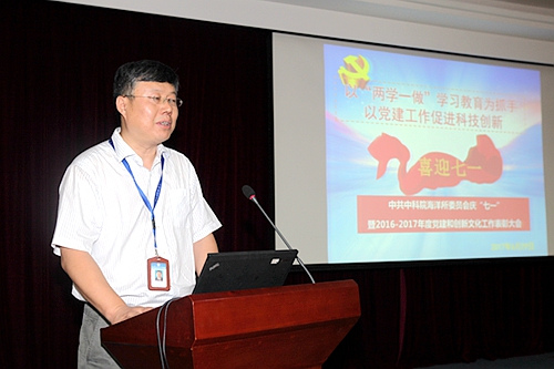 黨委書記王輝同志作了題為《以“兩學(xué)一做”學(xué)習(xí)教育為抓手,以黨建工作促進科研創(chuàng)新》的黨課報告,回顧總結(jié)了研究所“兩學(xué)一做”學(xué)習(xí)教育進展及成效,傳達了中共中央及中科院黨組關(guān)于“兩學(xué)一做”學(xué)習(xí)教育常態(tài)化制度化的有關(guān)精神,并部署了研究所2017年度黨建工作要點。他指出,過去一年海洋所黨建工作特色突出、成效顯著,有力促進了研究所的中心工作;希望全體黨員積極落實黨中央和院黨組要求,扎實推進“兩學(xué)一做”學(xué)習(xí)教育常態(tài)化制度化,以高度的政治責(zé)任感迎接黨的十九大召開。