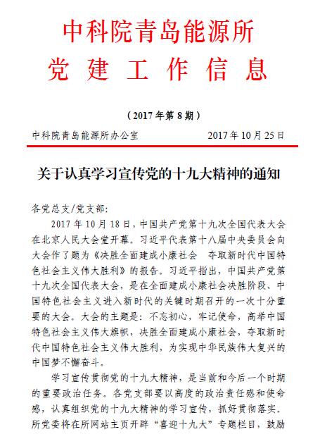 黨的十九大勝利召開后,青島能源所黨委高度重視、精心組織,帶動全所各級黨組織迅速掀起十九大精神學(xué)習(xí)熱潮。