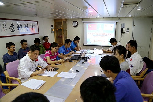 集中學習結束后,黨員們積極發(fā)言交流。輪機長靳憲芳談到,輪機部常年工作在全船噪音最大、溫度最高的地方,雖然十分辛苦,但仍要堅持用黨的理論和思想武裝自己,切身做好本職工作保障船舶的正常運行。大副劉兵認為,學習十九大精神要與工作崗位相結合,充分發(fā)揮黨員在“科學”號上的先鋒模范帶頭作用,做到“一個崗位就是一份責任,一個成果就是一份擔當”。船載實驗室主任呂亞軍表示,要像南仁東同志學習,全心全意為航次的科考任務做好服務保障。其他單位的黨員同志也積極發(fā)言交流,表示通過學習交流收獲很多,并感謝“科學”號團隊對他們本航次科學考察工作的幫助和支持。