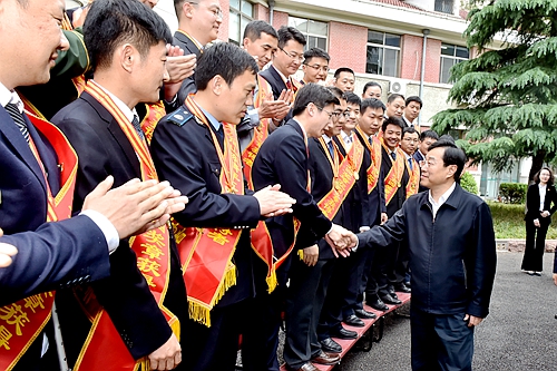 省委常委、組織部長(zhǎng)楊東奇與獲獎(jiǎng)?wù)氯藛T握手并表示祝賀
