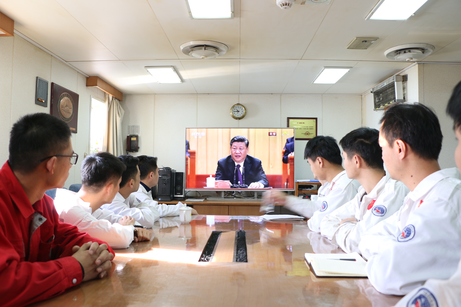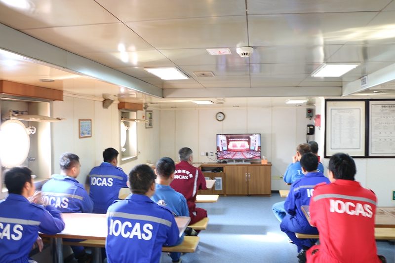 正在西太平洋執(zhí)行科考任務(wù)的“科學(xué)”號(hào)科考船收看大會(huì)