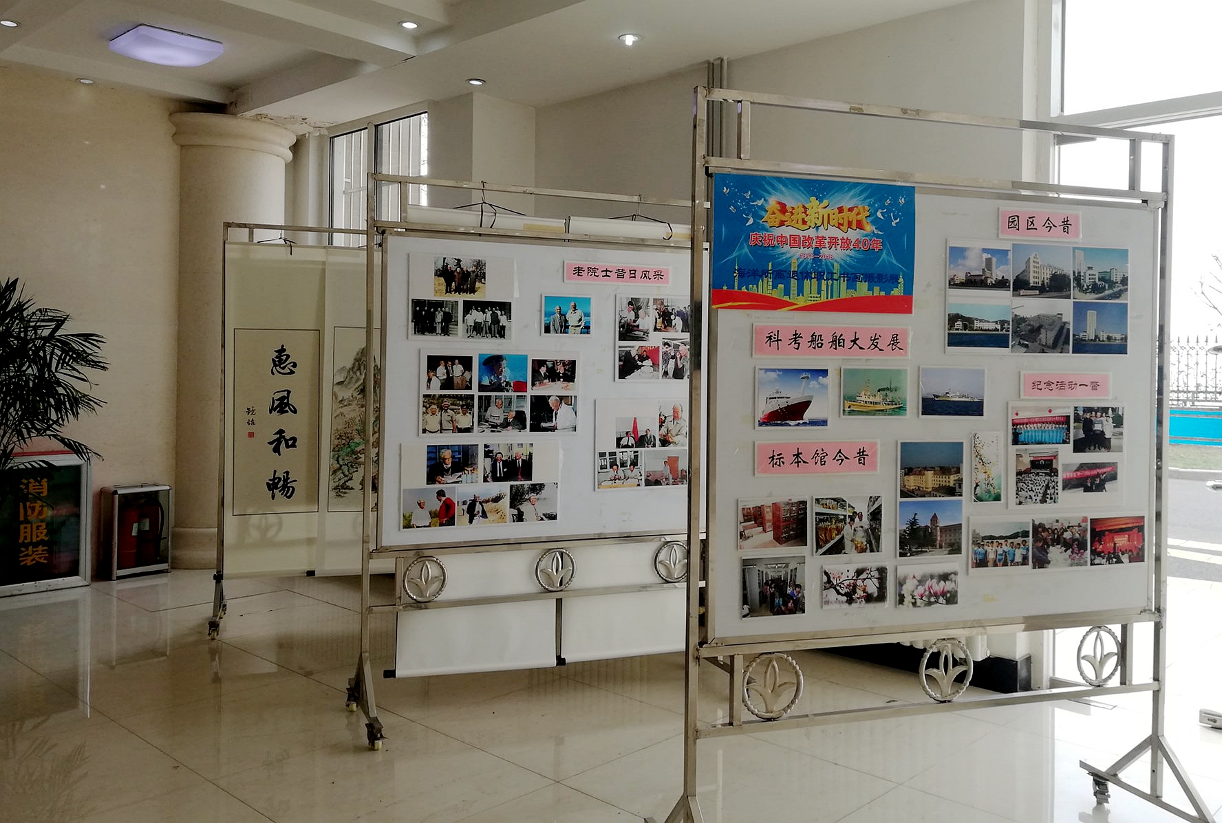 目前正在西太平洋執(zhí)行航次科考任務(wù)的“科學(xué)”號(hào)考察船以及泊靠碼頭休整的“科學(xué)三號(hào)”考察船組織船隊(duì)員同步收看,并在黨支部微信群中及時(shí)交流學(xué)習(xí)心得。離退休老同志舉辦了以“奮進(jìn)新時(shí)代”為主題的紀(jì)念改革開(kāi)放40年書畫攝影展。