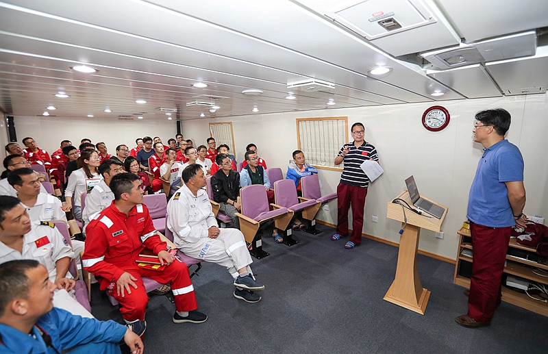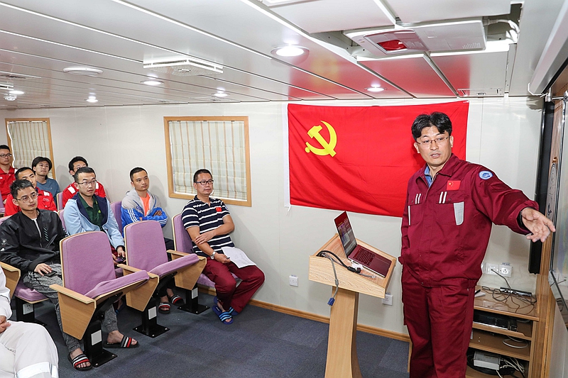 5月21日,正駛往馬里亞納海溝的“科學(xué)”號(hào)科考船上,“海上堡壘”臨時(shí)黨支部舉行“海洋強(qiáng)國 筑夢(mèng)深藍(lán)”主題黨日活動(dòng),臨時(shí)黨支部全體黨員和部分科考隊(duì)員等40多人參加活動(dòng)。