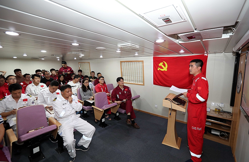 徐奎棟同志對全體黨員進(jìn)行動員教育。他表示,所黨委研究決定成立臨時(shí)黨支部是對科學(xué)考察工作一線黨建工作的重視,也是對航次臨時(shí)黨支部的重托。黨支部要嚴(yán)格執(zhí)行《中國共產(chǎn)黨支部工作條例(試行)》要求,加強(qiáng)對黨員的思想教育,同時(shí)將黨建工作與科考工作緊密結(jié)合,以黨建促科研,把黨建工作的成效體現(xiàn)在服務(wù)科研、凝聚人心、幫助群眾和培養(yǎng)人才上,將臨時(shí)黨支部建設(shè)成為真正的“海上戰(zhàn)斗堡壘”,有力保障科學(xué)考察任務(wù)安全順利完成。