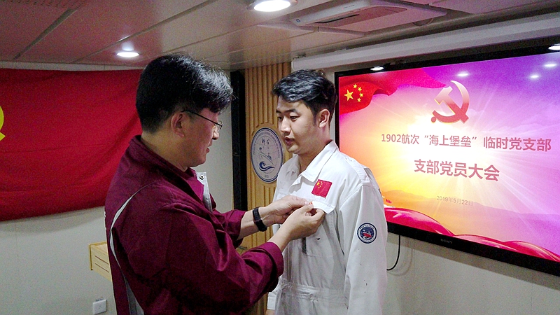 徐奎棟同志為“科學(xué)”號三副溫家興佩戴黨徽