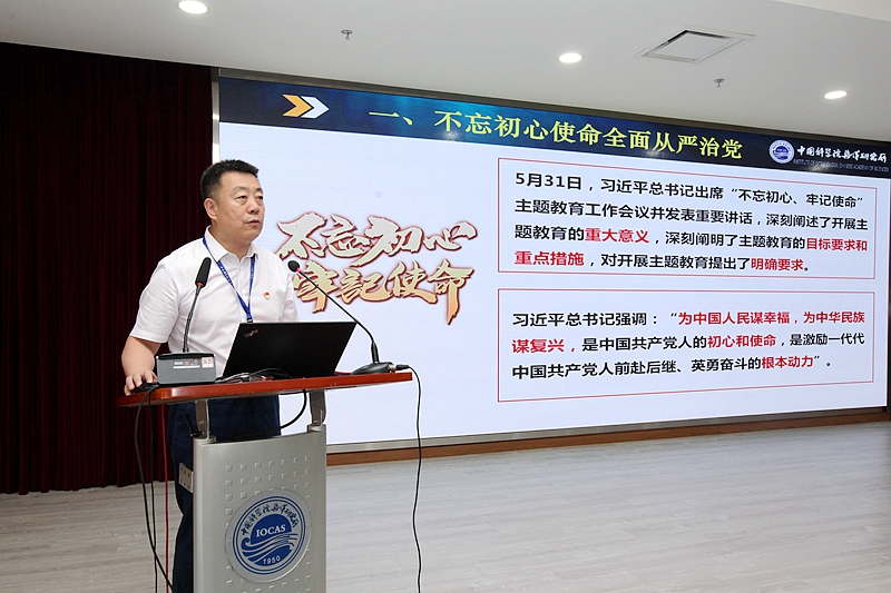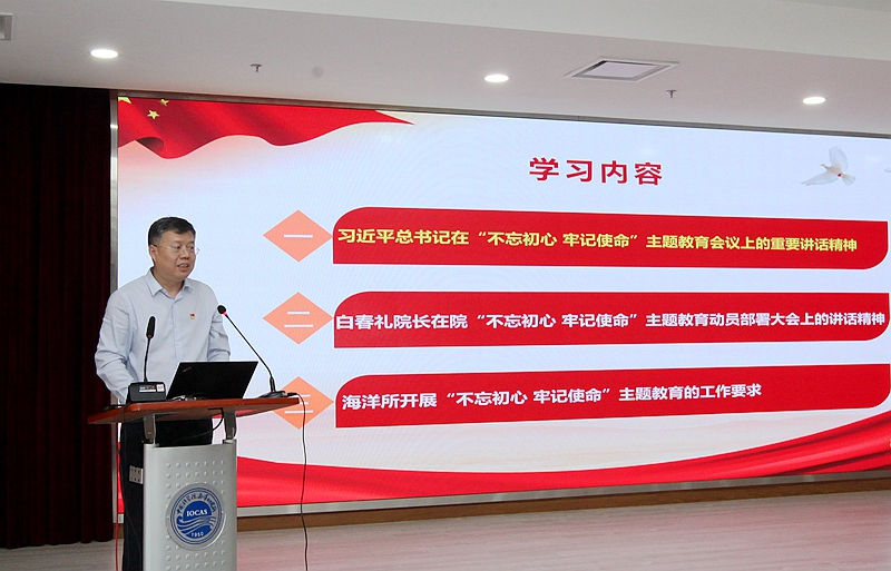 王輝同志作了《守初心 擔(dān)使命 找差距 抓落實》的主題教育專題報告。他從“習(xí)近平總書記在‘不忘初心、牢記使命’主題教育會議上的重要講話精神”“白春禮院長在院‘不忘初心、牢記使命’主題教育動員部署大會上的講話精神”“海洋所深入開展‘不忘初心、牢記使命’主題教育的工作方案與要求”三方面進(jìn)行了詳細(xì)解讀和推進(jìn)部署。他強調(diào),全所黨員特別是黨員領(lǐng)導(dǎo)干部要切實提升政治責(zé)任感,把開展“不忘初心、牢記使命”主題教育作為重大政治任務(wù)抓緊抓實抓好,與推進(jìn)“兩學(xué)一做”學(xué)習(xí)教育常態(tài)化制度化結(jié)合起來,與深入實施“率先行動”計劃結(jié)合起來,與推動中科院海洋大科學(xué)中心建設(shè)和兩所融合工作結(jié)合起來,與研究所開展的提升基層黨組織的組織力有關(guān)工作結(jié)合起來,確保主題教育取得扎實成效,更好地支撐服務(wù)創(chuàng)新驅(qū)動發(fā)展戰(zhàn)略和海洋強國建設(shè),以更加優(yōu)異的成績迎接新中國成立70周年、建院70周年和建所70周年。