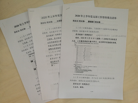 黨委辦公室集中梳理了上半年部署的重點工作任務19項,按照部署時間、部署方式、具體要求完成的任務內(nèi)容和時間節(jié)點,逐項列出清單下發(fā)各支部。8月10-14日,各黨總支、黨支部書記牽頭組織對照清單完成了全面自查,同時對照支部工作規(guī)范集中自查了“三會一課”記錄、黨費收繳、發(fā)展黨員工作等檔案材料。