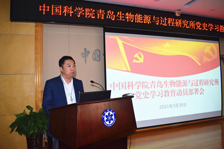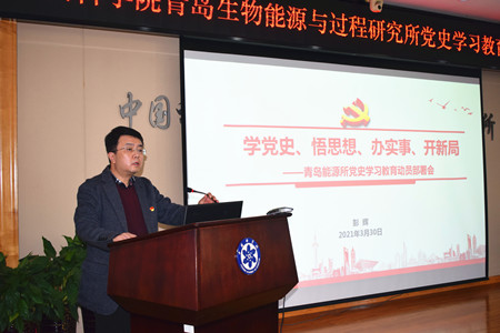 黨委書記、所黨史學(xué)習(xí)教育領(lǐng)導(dǎo)小組組長彭輝做了題為《學(xué)黨史、悟思想、辦實(shí)事、開新局》的報(bào)告,從黨中央關(guān)于開展黨史學(xué)習(xí)教育的重大決策、院黨組關(guān)于開展黨史學(xué)習(xí)教育的工作部署、青島能源所黨史學(xué)習(xí)教育工作安排三個方面做了動員部署。