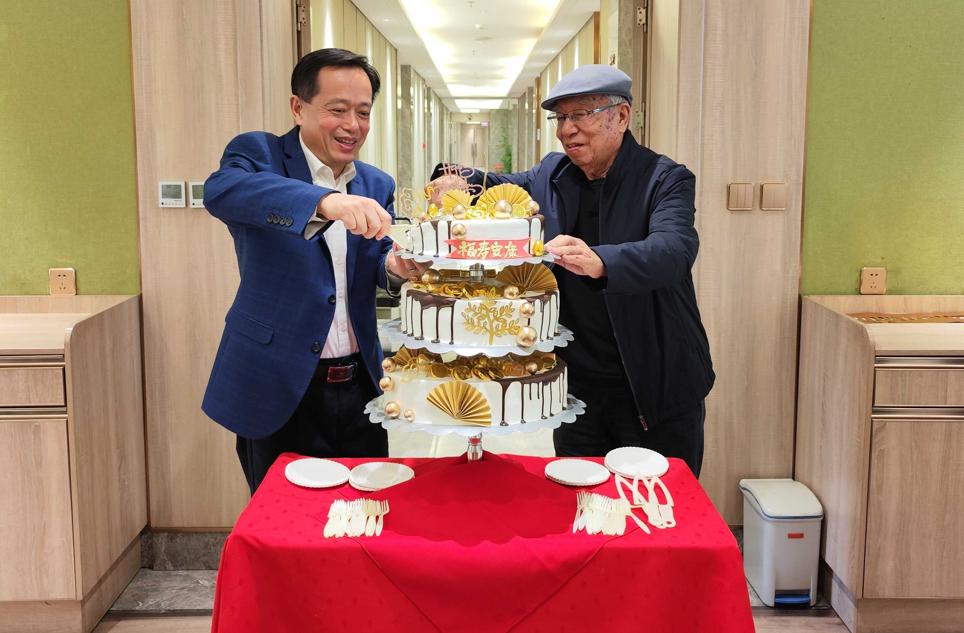 毛志遠與王學(xué)良共同切開節(jié)日蛋糕