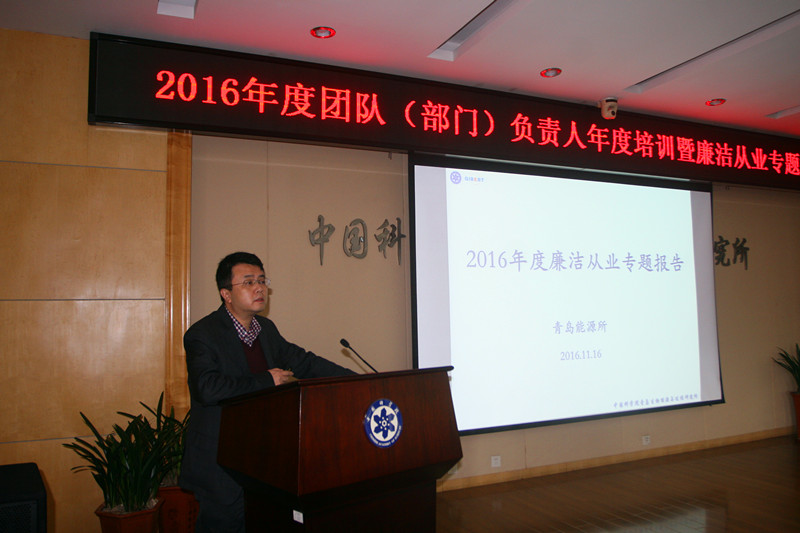 為提高廉潔從業(yè)意識,增強科研經(jīng)費管理能力,11月16日,青島能源所人力資源部、紀(jì)委聯(lián)合舉辦了研究所團隊(部門)負責(zé)人年度培訓(xùn)暨廉潔從業(yè)專題報告會,報告會由紀(jì)委副書記張瑞東主持,研究所副所長彭輝、呂雪峰,各團隊、部門負責(zé)人等約40人參加了會議。報告會分為三個部分,首先是彭輝副所長做廉潔從業(yè)專題報告,第二是所長、書記與新任團隊負責(zé)人進行廉潔從業(yè)提醒談話,第三是組織廉潔從業(yè)現(xiàn)場教育活動。