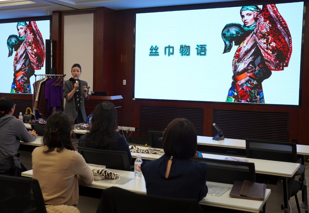 3月12日下午,邀請(qǐng)國(guó)家高級(jí)禮儀培訓(xùn)師慕丹為大家?guī)砹司蕦?shí)用的絲巾搭配課程。慕丹從絲巾的種類、材質(zhì)講起,詳細(xì)講解了不同場(chǎng)合、不同服飾的絲巾搭配技巧,并現(xiàn)場(chǎng)演示了多種絲巾系法。慕丹的講解生動(dòng)形象,現(xiàn)場(chǎng)氣氛輕松活躍。與會(huì)人員紛紛拿起手中的絲巾,跟著老師的步驟學(xué)習(xí)嘗試,互相交流心得。