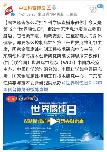 2020年4月24日是第12個(gè)“世界腐蝕日”,為提升社會(huì)公眾對(duì)腐蝕和腐蝕控制的認(rèn)識(shí)和了解,科學(xué)普及腐蝕學(xué)科在經(jīng)濟(jì)和生活中的重要作用,“世界腐蝕日”網(wǎng)絡(luò)科普活動(dòng)在沈陽(yáng)舉辦,活動(dòng)由(聯(lián)合國(guó))世界腐蝕組織(WCO)中國(guó)辦公室主辦,中科院沈陽(yáng)分院、中科院金屬研究所、廣東腐蝕科學(xué)與技術(shù)創(chuàng)新研究院聯(lián)合承辦。本次網(wǎng)絡(luò)科普活動(dòng)通過(guò)中國(guó)科普博覽微博現(xiàn)場(chǎng)直播,共1.9萬(wàn)網(wǎng)友在線收看。