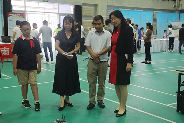 在渾南區(qū)中小學校科技教育成果展中,渾南區(qū)各中小學代表展示了暑期科技實踐成果,馬越紅與鄭向東一同聽取了學生代表的講解并向同學們表達了鼓勵和肯定。