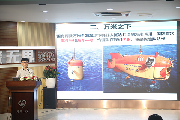 “科學家進校園”活動中,唐元貴作了題為“以科技力量探索萬米神秘海洋”的科普報告,通過講解、視頻、圖片等方式為同學們生動全面地講解了“海斗號”與“海斗一號”萬米深潛的過程,揭開萬米海底的神秘面紗。通過唐元貴的講解,極大地激發(fā)了同學們對探索科學的興趣,樹立了榜樣,并讓同學們深刻體會到了科學家科技報國、勇于擔當的精神。