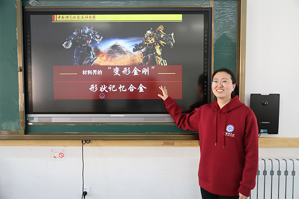 張慧博以“材料界的‘變形金剛’——形狀記憶合金”為主題,為同學們帶來了一場妙趣橫生、內(nèi)容豐富的科普報告。她通過有趣淺顯的小實驗生動介紹形狀記憶合金的功能、原理和應用情況。在互動環(huán)節(jié)中,學生們積極動手參與實驗過程,并且踴躍提出問題,現(xiàn)場氛圍十分熱烈。