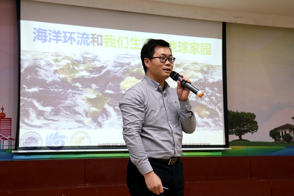 胡石建研究員為全體師生作了題為“海洋環(huán)流和我們生活的家園”的海洋科普?qǐng)?bào)告。胡石建研究員從直觀熟知的小問(wèn)題入手,如地球是什么顏色、地球與月球有什么不同等引出海洋的重要性,通過(guò)生動(dòng)的圖片和動(dòng)畫帶領(lǐng)學(xué)生們搭上海洋環(huán)流知識(shí)的奇妙旅程。孩子們乘著“海洋環(huán)流”過(guò)山車從南極漂到北極,從非洲漂到南美洲,穿過(guò)叢林、越過(guò)山脈,領(lǐng)略了海洋環(huán)流的重要性和神奇魅力。胡石建研究員通俗易懂地介紹了從古至今人類對(duì)海洋環(huán)流的測(cè)量方法和現(xiàn)代化的觀測(cè)技術(shù),把嚴(yán)肅深?yuàn)W的科學(xué)研究轉(zhuǎn)化成生動(dòng)有趣的演繹。學(xué)生們提出了很多有趣的問(wèn)題,胡石建研究員與現(xiàn)場(chǎng)100多位小學(xué)生進(jìn)行了熱烈的交流討論。