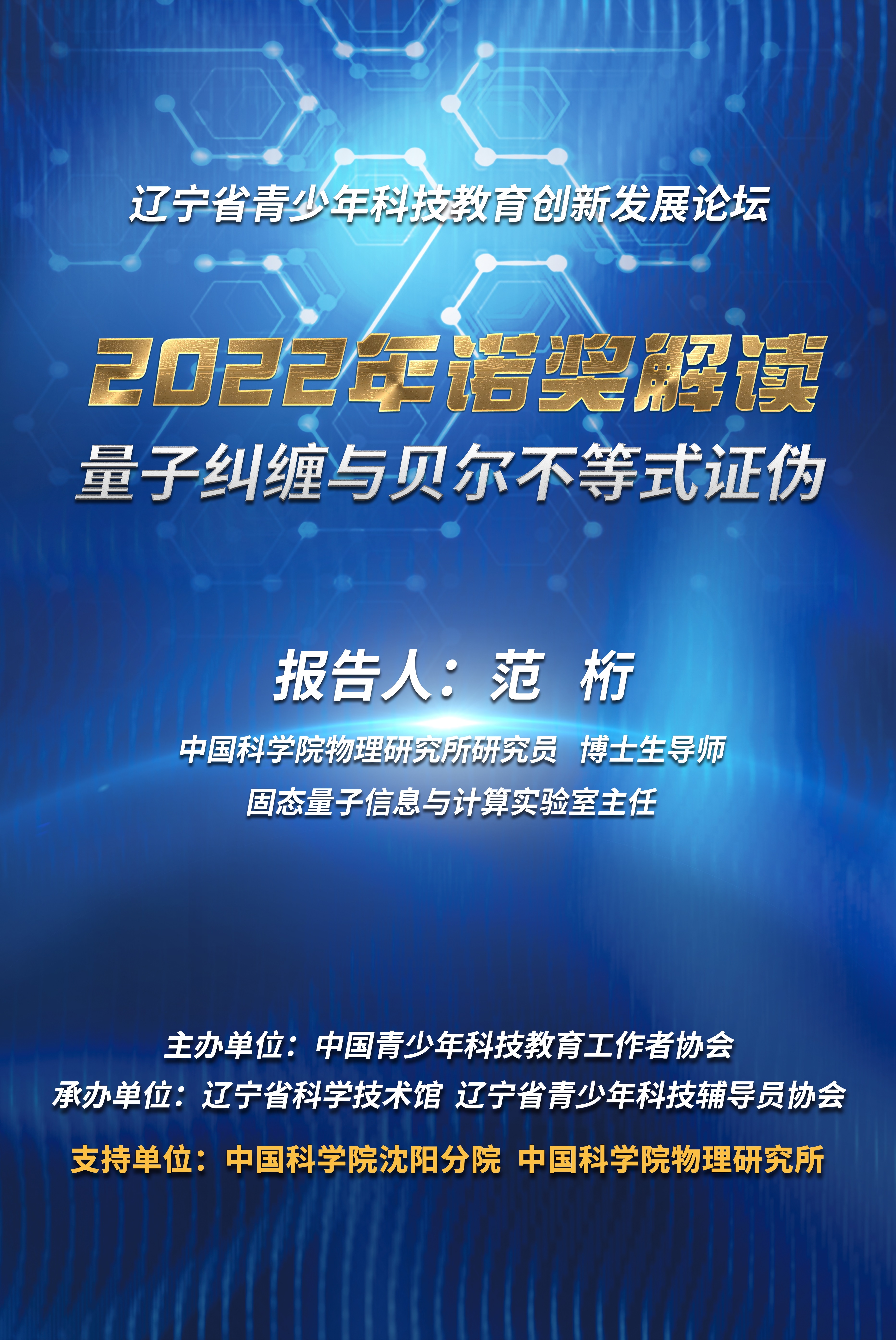11月17日上午,沈陽分院特別邀請中科院物理所研究員、博士生導師、固態(tài)量子信息與計算實驗室主任范桁作“2022年諾獎解讀——量子糾纏與貝爾不等式證偽”科普報告。范桁用通俗易懂的語言向參會人員解讀了2022年諾貝爾物理獎科學背景信息和獲獎者的主要學術貢獻,介紹了量子糾纏和貝爾不等式,并利用量子計算云平臺現場演示了如何實現貝爾不等式的違反。報告為拓寬科學教師科技前沿視野、理解掌握科學研究方法、開展科學教育創(chuàng)新實踐提供了有益的參考。