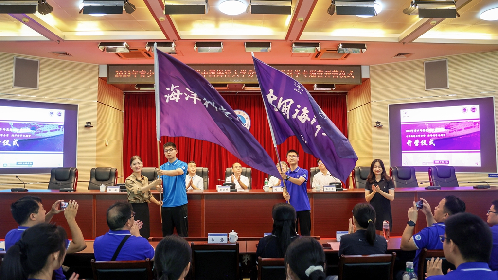 中國(guó)科學(xué)院海洋研究所綜合管理處副處長(zhǎng)王敏、中國(guó)海洋大學(xué)科學(xué)技術(shù)處副處長(zhǎng)宋欣共同為海洋科學(xué)專題營(yíng)、中國(guó)海洋大學(xué)分營(yíng)營(yíng)員代表授旗。