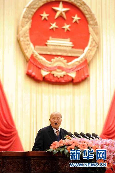 這是獲得2010年度國家最高科學技術獎的師昌緒院士代表2010年度國家科學技術獎勵獲獎人員發(fā)言。新華社記者 李濤 攝