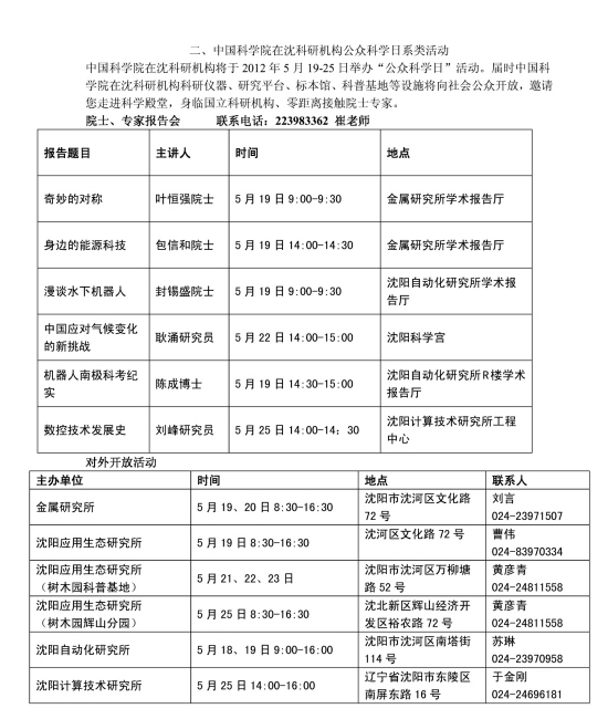 核心提示 每年5月的第三周,是國務(wù)院確定的全民科技活動周。以“攜手建設(shè)創(chuàng)新型國家”為主題的2012年科技活動周將于5月19日—25日在全國舉辦。 2012年遼寧省暨沈陽市科技活動周呈現(xiàn)出三大新變化。首先,是主會場安排在高校,這是沈陽市科技周舉辦十多年以來的第一次;同時,在高校舉辦高??萍汲晒c企業(yè)對接會、成果發(fā)布及政策解讀會也是第一次,有利于促進各高校間的科技工作交流和學(xué)習(xí)。 其次,是在系列科技活動中,中科院沈陽分院的科技資源全面向沈陽市民開放,是歷年來規(guī)模最大的一次??萍贾芷陂g舉辦“邀您走進科學(xué)殿堂,身臨國立科研機構(gòu)”活動,屆時中國科學(xué)院在沈科研機構(gòu)科研儀器、研究平臺、標本館、科普基地等設(shè)施將向社會公眾開放,包信和、封錫盛、葉恒強院士將舉辦3場科普知識講座,沈陽市民可以零距離接觸院士專家。 最后,是在主會場以舉辦產(chǎn)學(xué)研對接會為主要內(nèi)容的科技周也是歷屆科技活動周的第一次,也體現(xiàn)了科技創(chuàng)新這個主題。特別是有針對性地征求了企業(yè)的需求信息,以及各高校在成果轉(zhuǎn)讓方面的信息,是今后科技計劃攻關(guān)項目更加體現(xiàn)務(wù)實和創(chuàng)新的一次探索。 主會場科技活動 科技周主會場活動將于5月19日10:00-17:00在沈陽理工大學(xué)舉行 ◆沈陽工業(yè)領(lǐng)域產(chǎn)學(xué)研推進對接會 為深入推進工業(yè)領(lǐng)域產(chǎn)學(xué)研合作,按照企業(yè)的技術(shù)需求,組織沈陽工業(yè)大學(xué)等11所高校及科研院所展示相關(guān)的技術(shù)成果,通過雙方見面洽談的形式,推進沈陽市產(chǎn)學(xué)研成果轉(zhuǎn)化工作。 承辦單位:市科技局、沈陽工業(yè)大學(xué)等11所高校 ◆產(chǎn)學(xué)研合作項目發(fā)布暨科技創(chuàng)新政策培訓(xùn)會 由承擔(dān)863項目的單位向企業(yè)發(fā)布在高端裝備制造、節(jié)能環(huán)保和信息技術(shù)等產(chǎn)業(yè)應(yīng)用成果信息,大學(xué)城、特種機床城等單位發(fā)布項目投資信息。由專業(yè)人員宣講企業(yè)研發(fā)費用加計扣除政策。 承辦單位:市科技局、沈陽科技總院 ◆沈陽科技創(chuàng)新成果展 通過照片、文字和圖表等方式,從新一代信息技術(shù)、節(jié)能環(huán)保、新能源、高端裝備制造、新材料、新能源汽車等產(chǎn)業(yè)展示沈陽市近幾年來的科技創(chuàng)新成果。 承辦單位:沈陽科學(xué)宮 ◆健康與生活科普知識展 為增強公眾珍惜資源、保護資源、節(jié)約資源,促進資源可持續(xù)利用的意識,通過70余塊展板,系統(tǒng)展示健康與人們生活密切關(guān)系,提高公眾的科學(xué)素養(yǎng),倡導(dǎo)健康生活。 承辦單位:市科協(xié) ◆兵器科普知識展 通過大量的國內(nèi)外武器裝備實物和仿真模型展示以及兵器知識展板的宣傳,展示我國國防建設(shè)的巨大成就,向公眾普及國防科技知識。 承辦單位:沈陽理工大學(xué) ◆科技創(chuàng)新政策法規(guī)宣傳活動 為推進沈陽建設(shè)國家創(chuàng)新城市建設(shè),根據(jù)企業(yè)的需求,通過展板展示、發(fā)放宣傳資料、現(xiàn)場咨詢等方式,系統(tǒng)宣傳沈陽市科技創(chuàng)新政策和法規(guī),為企業(yè)用好、用足科技創(chuàng)新政策及應(yīng)用法律法規(guī)保障合法權(quán)益提供參考和幫助。 承辦單位:市科技局 二、中國科學(xué)院在沈科研機構(gòu)公眾科學(xué)日系列活動 中國科學(xué)院在沈科研機構(gòu)將于2012年5月19日-25日舉辦“公眾科學(xué)日”活動。屆時,中國科學(xué)院在沈科研機構(gòu)科研儀器、研究平臺、標本館、科普基地等設(shè)施將向社會公眾開放,邀請您走進科學(xué)殿堂,身臨國立科研機構(gòu),零距離接觸院士專家。 三、科普基地系列活動 科技周期間,沈陽市60家科普基地全面開放,結(jié)合各自特色開展豐富多彩的科學(xué)普及體驗、參觀、競賽活動。 |