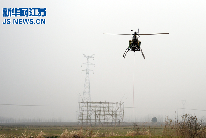新華網(wǎng)南京1月16日電 當日,江蘇鹽城供電公司首次采用無人直升機架設輸電線路。據(jù)了解,本次架線需要跨越道路、河流和大片樹林,施工難度較大,采用傳統(tǒng)的人工牽引步行方式放線需一個星期,而使用無人直升機放線方式僅需1天即可完成。同時,直升機放線對環(huán)境影響小,避免了對農田青苗和樹林的破壞。(顧鋒明 攝)