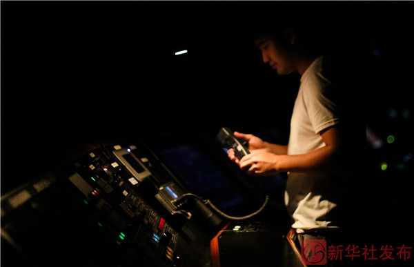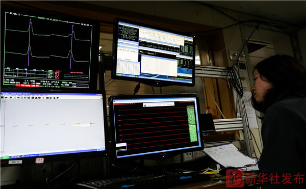 ↑船隊員王林淼在“科學(xué)”號的地球物理實驗室查看多道地震的數(shù)據(jù)采集情況(2月19日攝)。