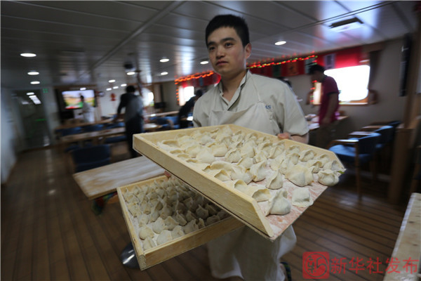 ↑“科學(xué)”號廚師陳俊把隊員們剛包好的餃子運送至后廚(2月18日攝)。