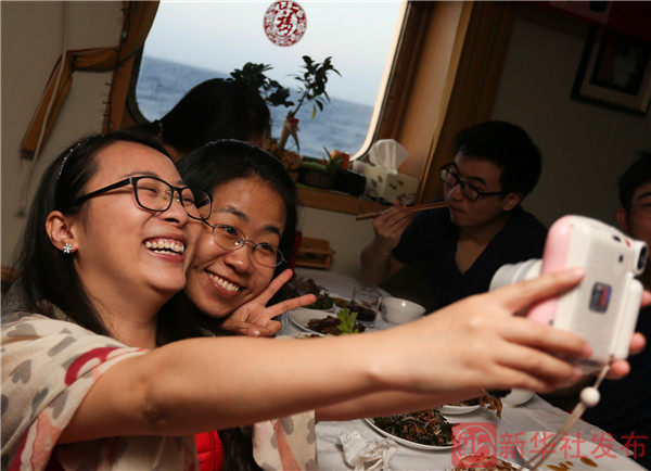↑在“科學(xué)”號的年夜飯上,科考隊員們自拍留念(2月18日攝)。