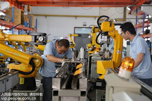 2015年8月25日,在浙江瑞宏機器人有限公司車間里,技術人員正在調(diào)試機器人。(魏煒攝/人民圖片)