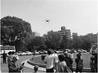 天空中 當(dāng)演示人員將手抬高,無人機(jī)也隨之升高,手降低時(shí),無人機(jī)也隨之降低。