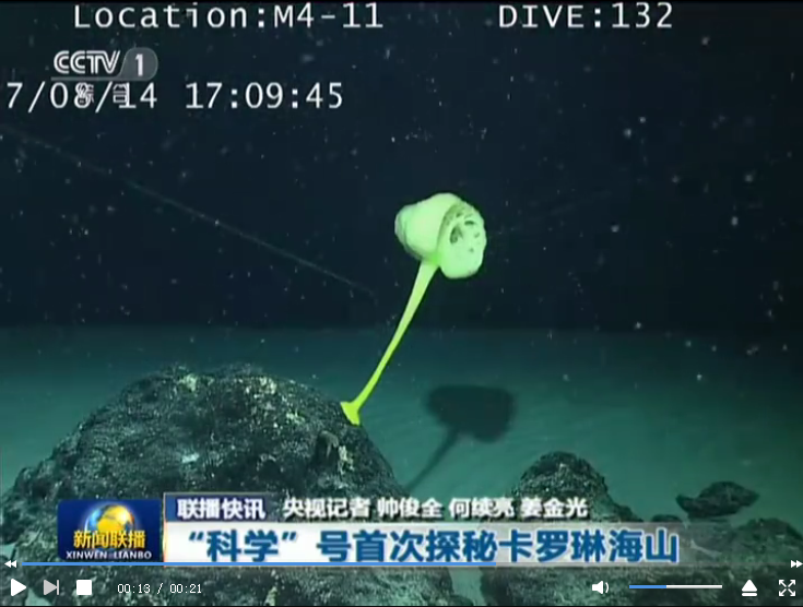 正在執(zhí)行中科院海洋先導(dǎo)專項(xiàng)的新一代海洋科學(xué)綜合考察船“科學(xué)”號(hào)近日在西太平洋卡羅琳海山進(jìn)行了首次下潛作業(yè),通過搭載的“發(fā)現(xiàn)”號(hào)潛器采集到一株約80厘米高的淡黃色海綿、一株稀有的偕老同穴海綿等。這也是人類首次對(duì)卡羅琳海山進(jìn)行科學(xué)考察。