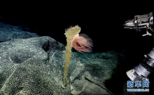 4月1日,“發(fā)現(xiàn)”號(hào)深海機(jī)器人在海山采集捕蠅草??麡悠?。新華社記者 張建松 攝