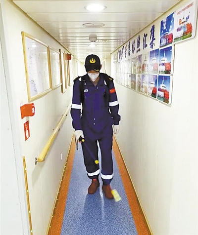下圖 “科學(xué)”號科研人員進行船艙內(nèi)消毒。