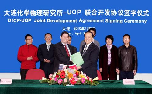 上午11時,“大連化物所—UOP聯(lián)合開發(fā)協(xié)議”簽字儀式舉行,張濤所長和Ben A.Christolini先生作為雙方代表簽署了協(xié)議,并表示希望雙方的合作研究項目早日取得成功。雙方將致力于在生物質制化學品方面的合作。UOP公司和所內相關人員出席了簽字儀式。