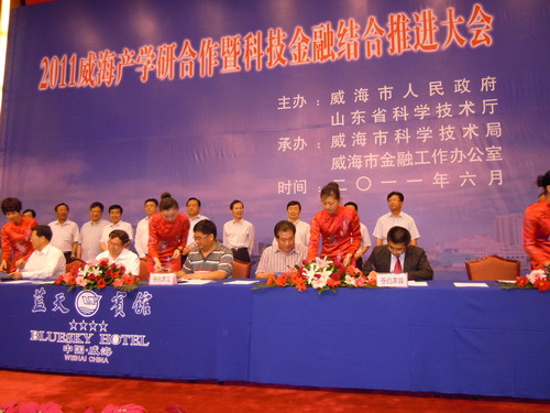 2011年6月25日,由山東省科技廳、威海市政府主辦,威海市科技局、威海市金融工作辦公室和中科院山東中心威海分中心承辦的 “2011威海產(chǎn)學(xué)研合作暨科技金融結(jié)合推進(jìn)大會(huì)”在威海市舉行。山東省科技廳廳長翟魯寧,威海市委書記王培廷、市長孫述濤,中科院沈陽分院副院長韓恩厚,四川大學(xué)常務(wù)副校長李光憲,山東省科技廳副廳長、中科院山東中心主任王曉斌等領(lǐng)導(dǎo)和大學(xué)、科研機(jī)構(gòu)、地方企事業(yè)單位共600余人出席會(huì)議。威海市委常委、副市長董進(jìn)友主持了大會(huì)開幕式。