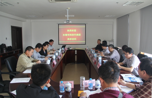 2015年5月14日,在沈陽分院科技處副處長(zhǎng)、山東中心常務(wù)副主任王東升陪同下,東營(yíng)市科技局副局長(zhǎng)李樹坤率領(lǐng)東營(yíng)市部分骨干化工企業(yè)等負(fù)責(zé)人一行10人到大連化物所進(jìn)行對(duì)接和調(diào)研。