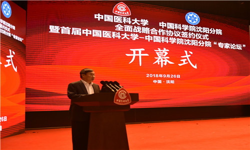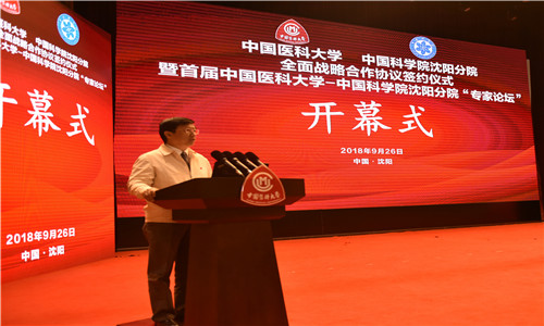 2018年9月26日,中國科學院沈陽分院與中國醫(yī)科大學全面戰(zhàn)略合作協(xié)議簽約儀式暨首屆中國科學院沈陽分院中國醫(yī)科大學專家論壇在中國醫(yī)科大學舉行。沈陽市政府副市長閻秉哲、遼寧省科學技術(shù)廳副廳長杜秉海、沈陽分院分黨組書記姬蘭柱、副院長馬越紅、中國醫(yī)科大學黨委書記朱京海、中國醫(yī)科大學副校長劉瑩、中國醫(yī)科大學黨委常委王振寧、沈陽市科學技術(shù)局副局長李志勇等出席了會議,會議由中國醫(yī)科大學校長聞德亮主持。
