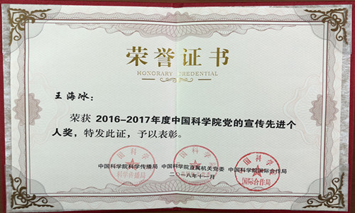 日前,為鼓勵在中國科學(xué)院科學(xué)傳播工作中做出突出成績的集體和個人,依據(jù)有關(guān)管理辦法,院科學(xué)傳播局、直屬機關(guān)黨委、國際合作局堅持 “科學(xué)嚴謹、目標導(dǎo)向、公正公平、注重實效” 的原則,共同組織開展了2016—2017年度中國科學(xué)院科學(xué)傳播獎的評選工作,共評選出先進單位獎10個,單項集體獎24個,先進個人獎24個。沈陽分院榮獲科學(xué)傳播先進單位獎、黨的宣傳先進單位獎,王海冰獲得黨的宣傳先進個人獎。