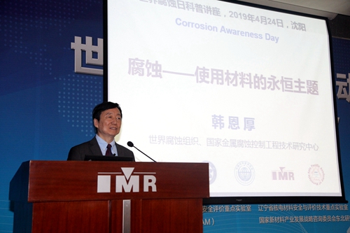 前世界腐蝕組織主席(第四任,2016.03—2019.03)、中國(guó)科學(xué)院沈陽(yáng)分院院長(zhǎng)、中國(guó)科學(xué)院金屬研究所研究員韓恩厚為社會(huì)公眾作了題為《腐蝕-使用材料的永恒主題》的精彩報(bào)告。韓恩厚從什么是腐蝕,腐蝕給我們?nèi)粘I顜?lái)的威脅,對(duì)國(guó)家的重大工程如航天、核電、油氣、高鐵和橋梁等基礎(chǔ)設(shè)施等造成的重要影響,以及如何控制和利用腐蝕等方面進(jìn)行了全面的介紹。