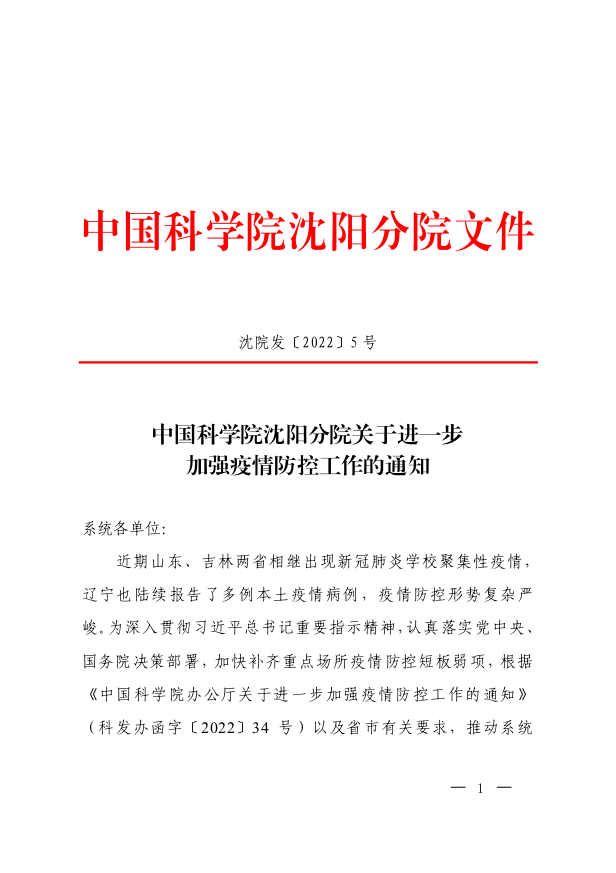 《中國科學(xué)院沈陽分院關(guān)于進(jìn)一步加強(qiáng)疫情防控工作的通知》