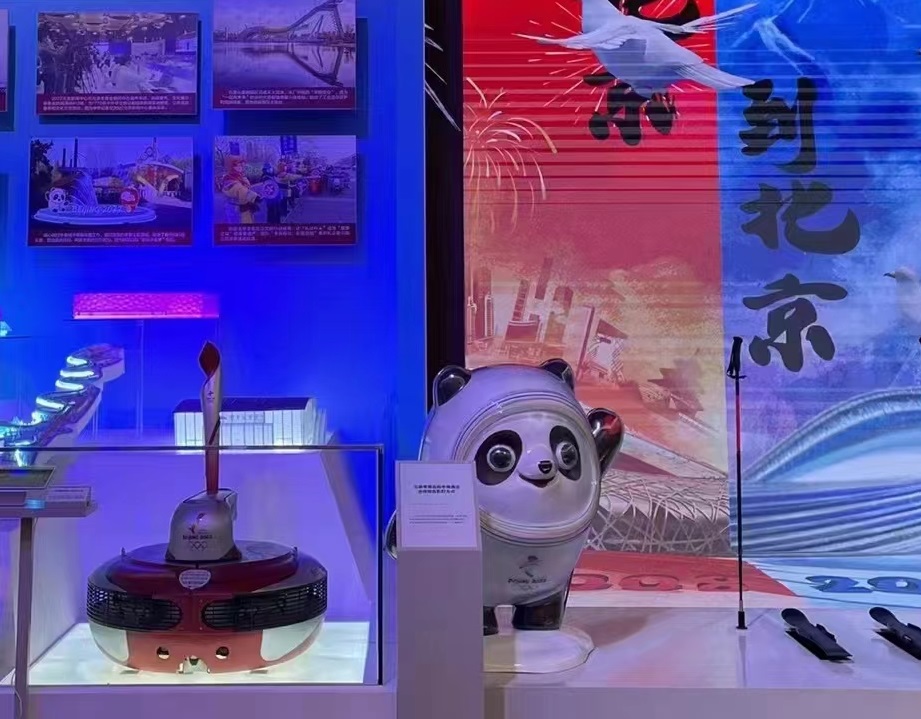 北京冬奧展區(qū)——北京冬奧會(huì)水下火炬?zhèn)鬟f機(jī)器人(圖中,冰墩墩左側(cè))