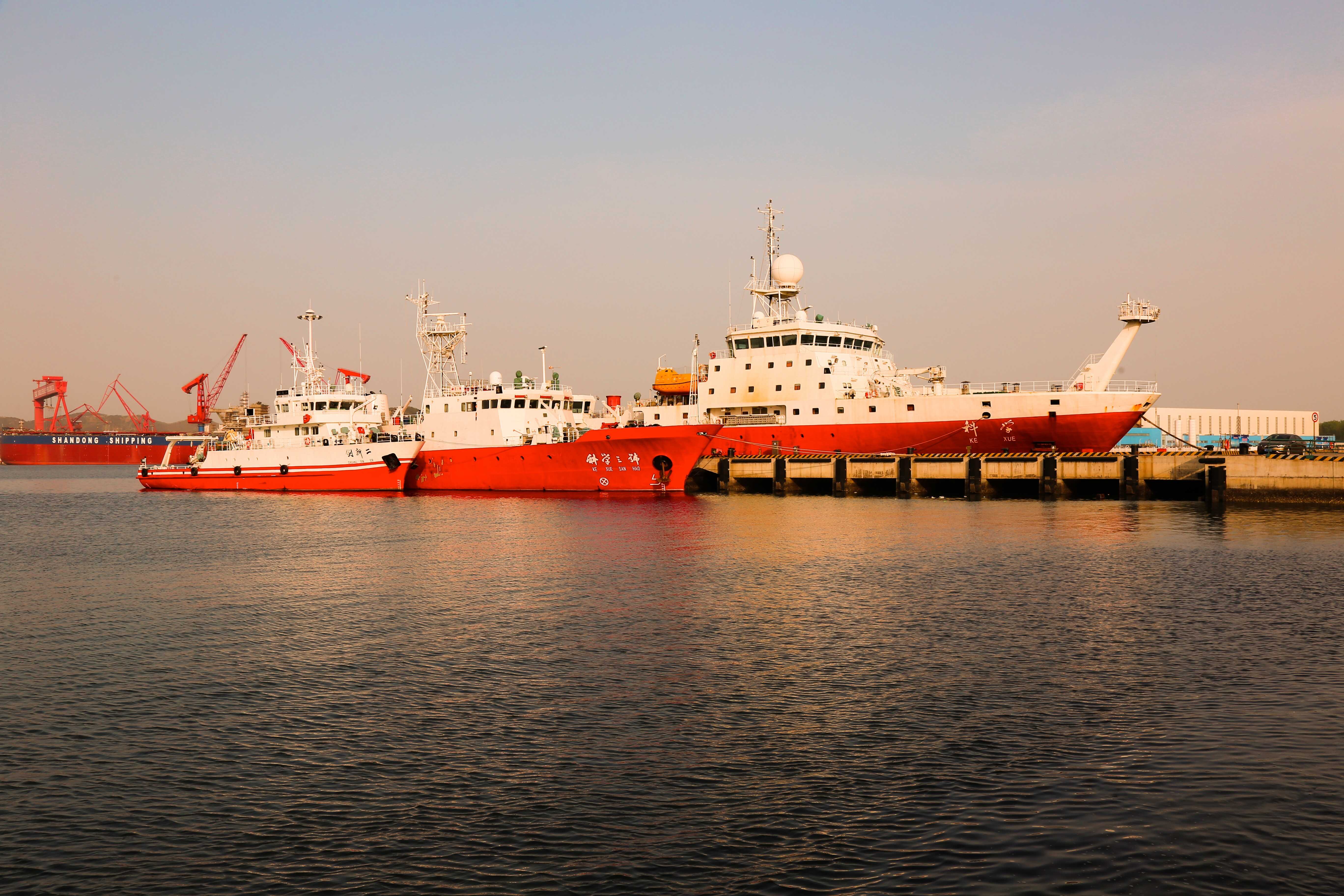 夕陽下中科院海洋所“科學(xué)”號(hào)、“科學(xué)三號(hào)”和“創(chuàng)新二號(hào)”三艘海洋科學(xué)綜合考察船齊聚??磕父鄣漠嬅?,展示海洋所科考船的嶄新風(fēng)貌和雄厚實(shí)力,為我國海洋科學(xué)和技術(shù)的發(fā)展提供了重要支撐。夕陽下,各艘科考船在海中形成的倒影,魅力無限,襯托出船舶??磕父鄣膶庫o之美。